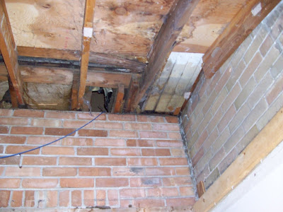 Project on the house that is! Brett wanted to take out a small portion of the entry way ceiling because it was leaking. He ended up ripping out EVERYTHING! The morons before us decided to just put plastic up near the leak instead of fixing the roof. What happens when you do that??! Lots of mold! Well not anymore because Brett tore it all out. The bonus though is we get to have a vaulted ceiling in the entry way! WHOO HOO! The scary thing is we don't think any of the additions are up to code....not even close.....I hope we don't find anymore surprises!